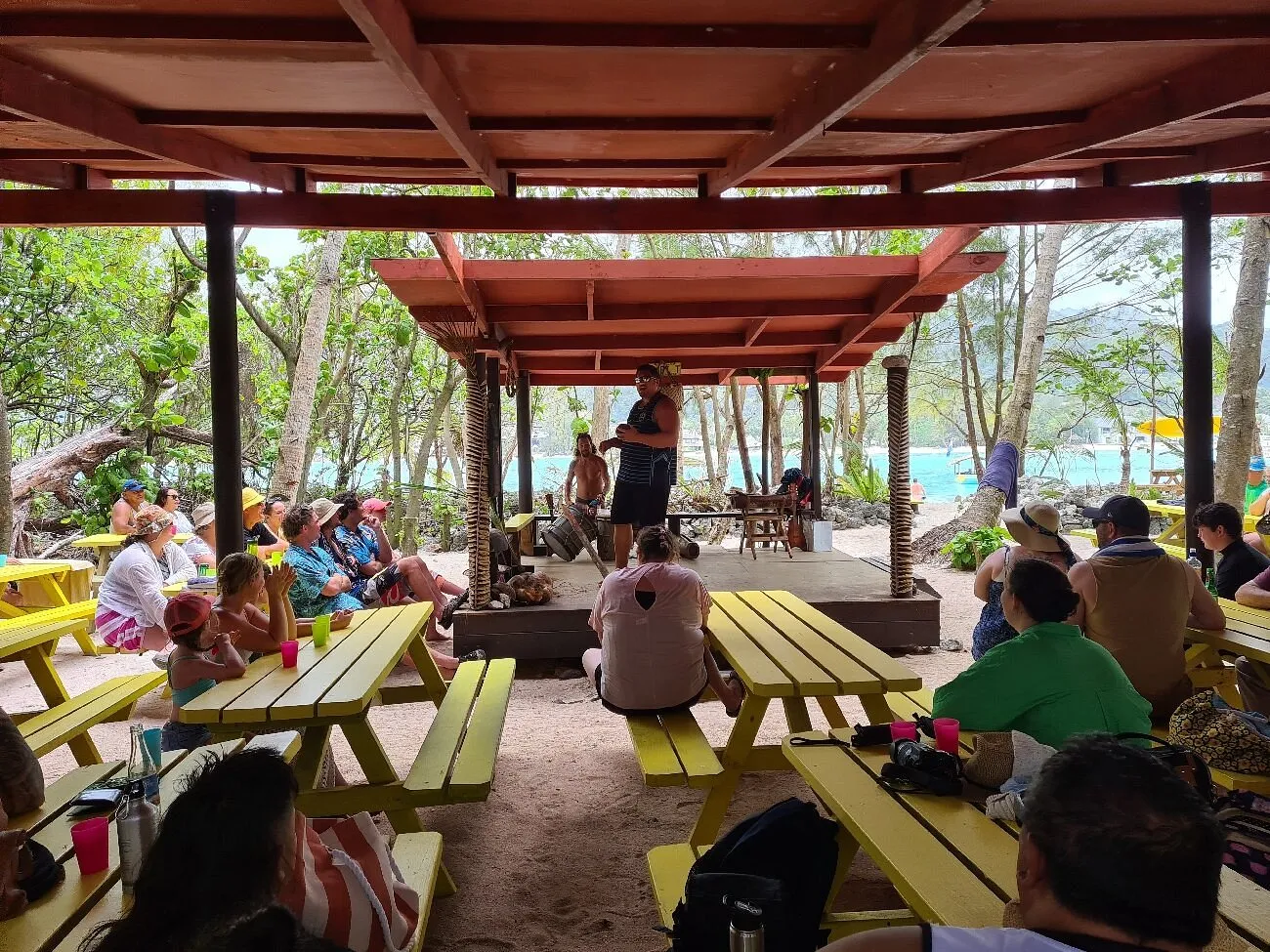 One of the standout features of this excursion is the island-style fresh fish open fire BBQ, served with refreshing salads and seasonal fruit. Guests can also enjoy engaging with the local culture through a pareu (sarong) tying and coconut husking show, accompanied by live music from the crew both onboard and at the motu.