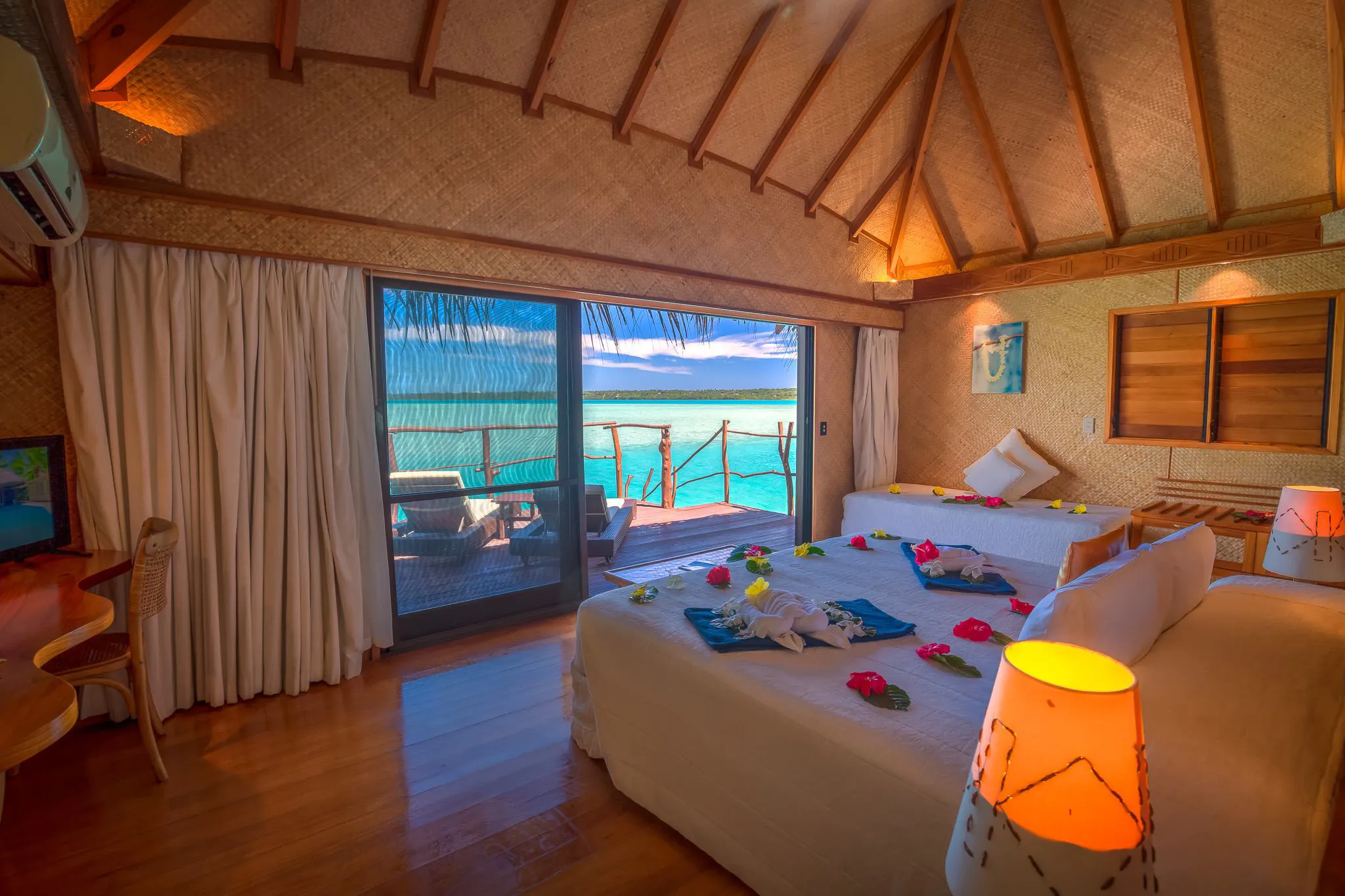 Accommodations at the resort include a selection of well-appointed bungalows and villas, each featuring an array of standard amenities. The Overwater Bungalows are distinctively Polynesian in style and offer direct access to the lagoon, while the Royal Honeymoon Private Pool Villa “Princess Te Arau” is a luxurious retreat featuring a private swimming pool and lush tropical gardens. Additionally, the Deluxe Beachfront Bungalows and Premium Beachfront Bungalows offer spectacular beachfront views and serene surroundings on Akitua Private Island.