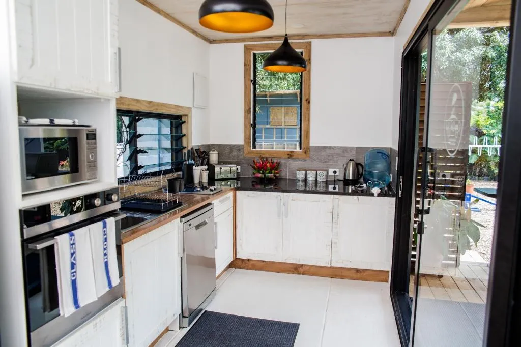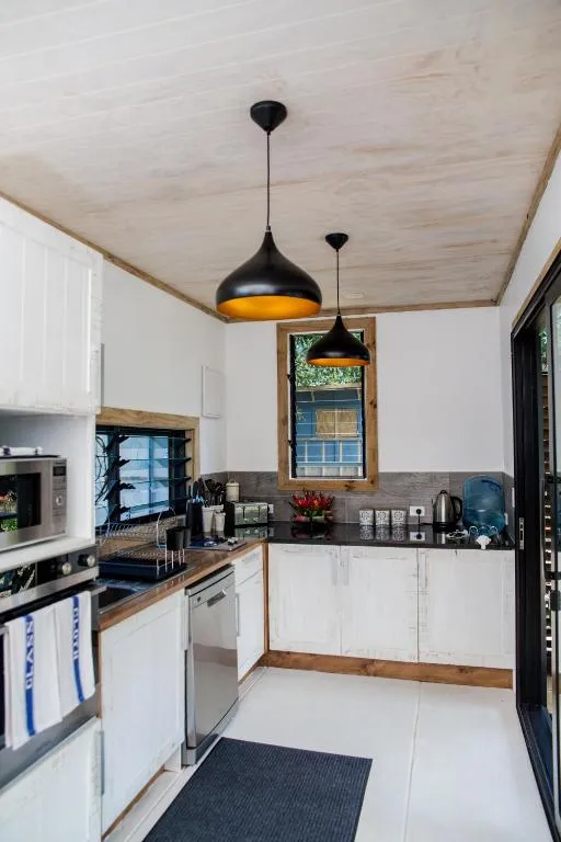 The villas' living areas are designed to promote relaxation and socializing, featuring a large covered deck with an 8-seater dining table and a comfortable L-shaped outdoor couch overlooking the pool and garden. The deck is equipped with ceiling fans and lighting to enhance the tropical evening atmosphere. Inside, a modern kitchen with high-quality appliances and utensils ensures a seamless self-catering experience.