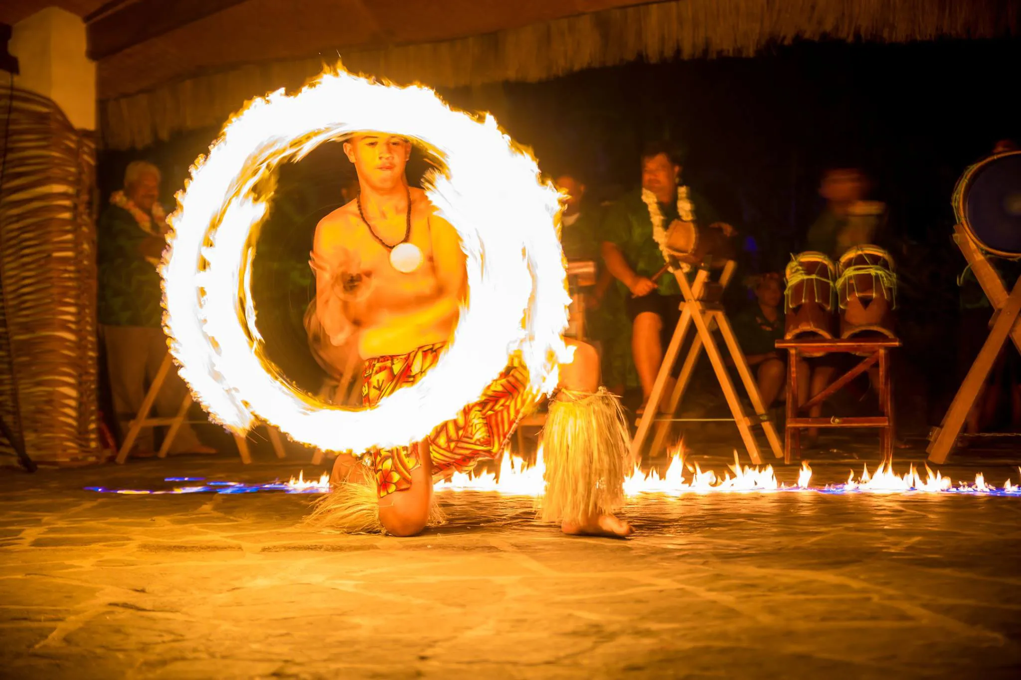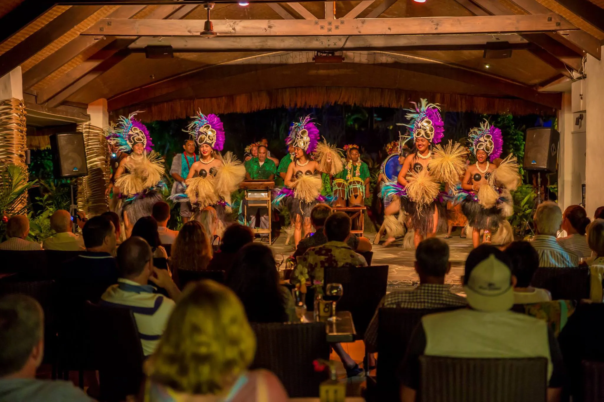 At 8:30pm "Aitutaki time," the captivating Cultural Dance Show begins with Tamanu's performers dressed in traditional costumes, taking guests on a mesmerizing journey through the South Pacific. The performance includes authentic dance, beautiful costumes, hand clapping, and singing, all accompanied by the upbeat rhythm of Pacifica drums. Additionally, guests have the opportunity to witness the warrior men dancing with fire, while the Cook Island women move gracefully and sing in sweet harmony. Not only can guests observe this spectacular display, but they are also encouraged to join in and try the dances themselves.