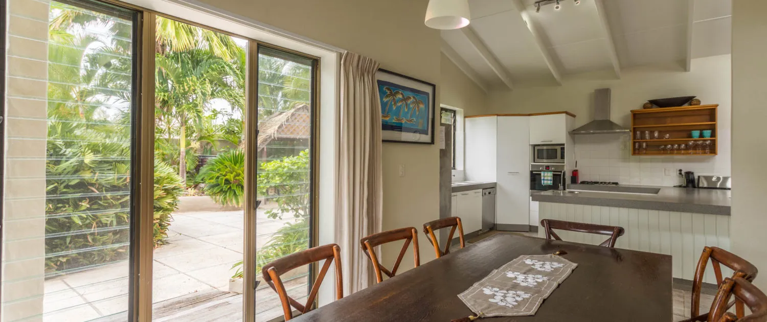 Each air-conditioned bedroom is luxurious, with the main bedroom opening onto the terrace and beach, featuring a full ensuite. The property also includes a fully equipped laundry and covered carport. Insect screens, ceiling fans, and a security safe are provided for added comfort and security.