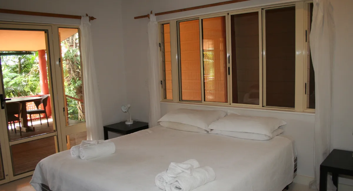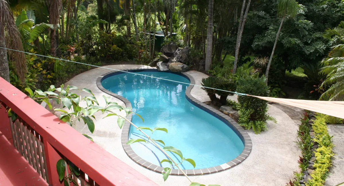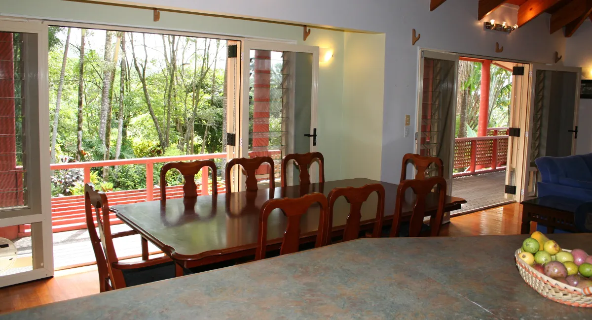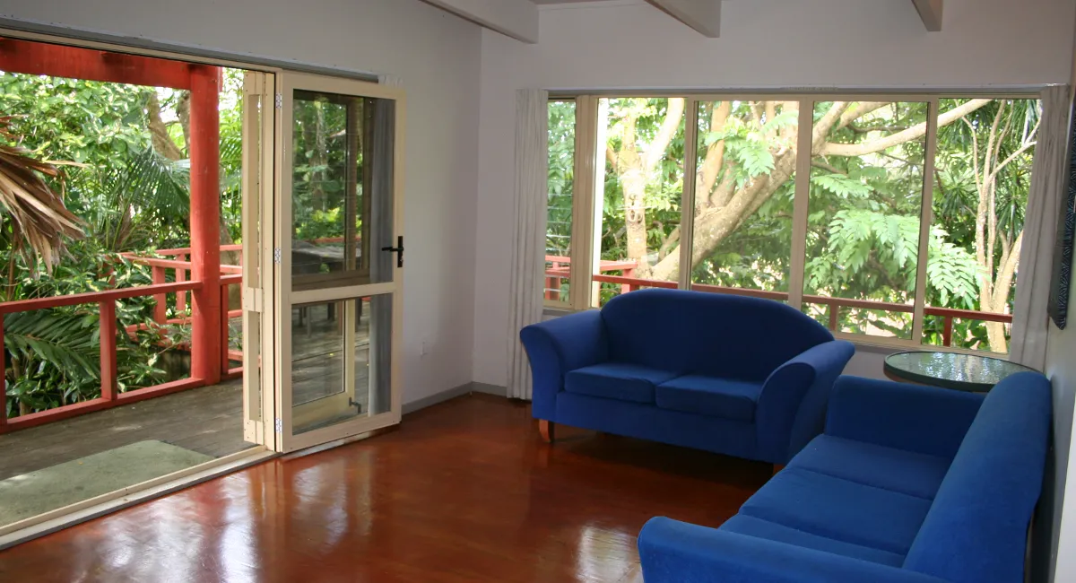 The main house offers a massive indoor living area, two bedrooms (one with an ensuite), and a fully equipped open-plan kitchen. The verandah overlooks the pool, providing a relaxing space for guests to unwind. Another apartment, located along the verandah, offers a unique tree-house-like experience with its own outdoor area. The lodge also includes a roomy one-bedroom apartment downstairs, closest to the pool, which opens to its own secluded seating area. Guests can also appreciate the lush tropical garden surrounding the property, adding to the serene ambiance of the accommodation.