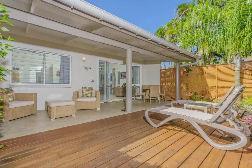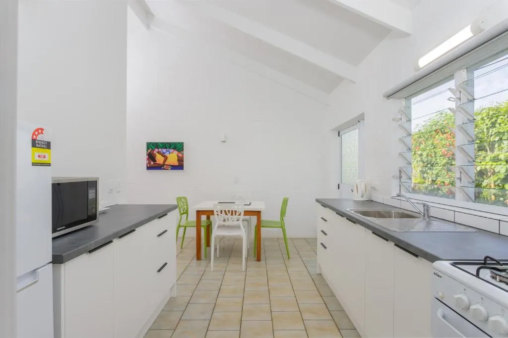 The resort offers a variety of amenities including a communal BBQ area, laundry facilities, and on-site parking. Guests can also enjoy complimentary snorkeling gear, kayaks, and bicycles to explore the crystal clear lagoon and the nearby beach. The lush tropical gardens provide a serene backdrop while the pool area offers a refreshing oasis to cool off.