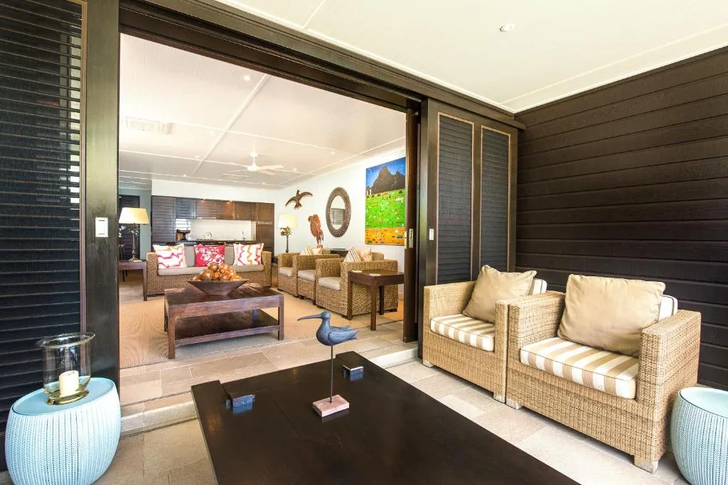 The one-bedroom villas cover an area of 93 square meters and can accommodate up to two guests. Offering two options for bed configuration - a four-poster King bed and a King bed that can be split into two singles. These villas boast a large private veranda with ocean views, an ideal spot for relaxation, as well as a fully appointed kitchen for self-catering options. On the other hand, the two-bedroom villas are more spacious at 170 square meters and can host up to four adults, with an additional rollaway bed for a child over 12 or an adult. Both bedrooms in these units have their own private balcony with lagoon views and ensuite bathrooms, and a large daybed and seating for 8 on the veranda.