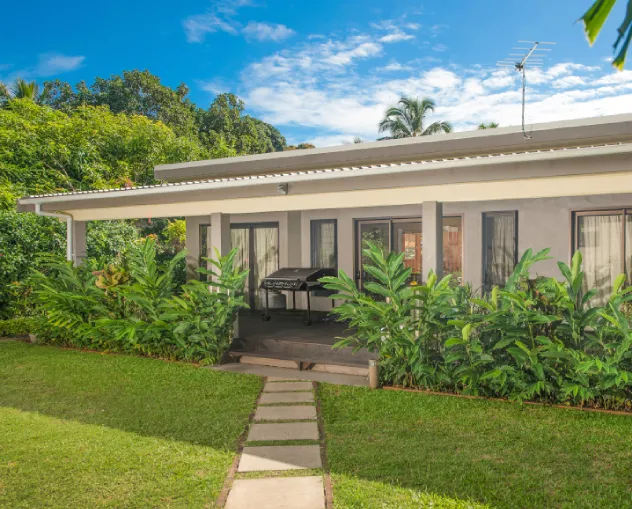 The outside space of each villa offers a private tropical garden, sun loungers, an outdoor gas barbecue, and a large covered deck for relaxation. The property also boasts a shared, unfenced pool, providing a perfect spot to cool off and sunbathe during the stay.